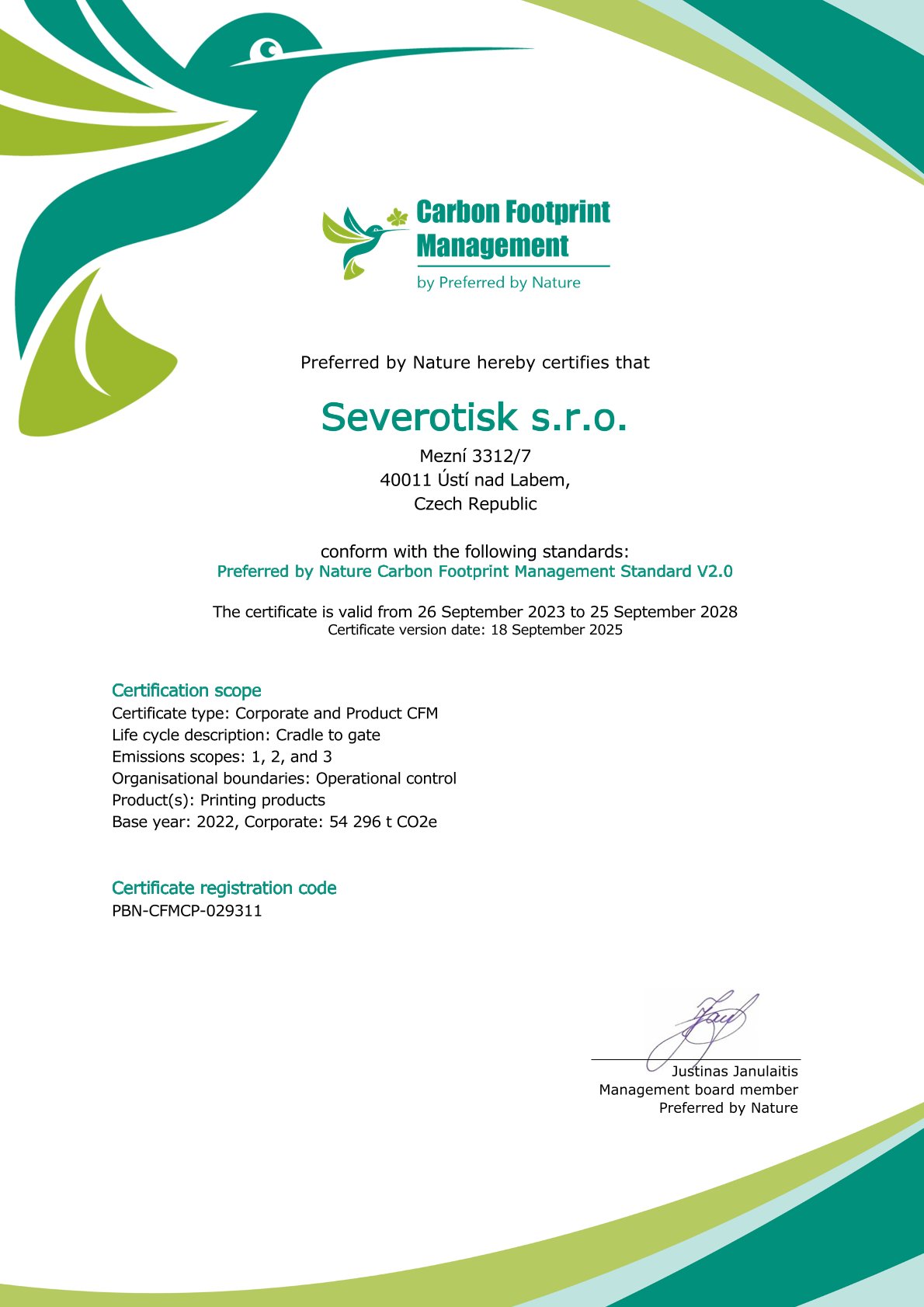 Since we do not want the certificates on quality and environmental friendliness of our printing production to sound like hollow promises, we have their validity regularly verified by independent auditors. We hold several internationally recognized ISO certificates which serve as a guarantee to all our customers that they always receive first-class and environmentally friendly services from us. At the same time, we are fully aware of our share of responsibility for the future of our planet and the purity of nature that surrounds us.